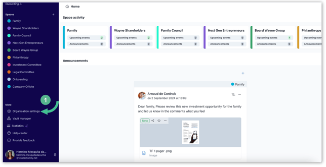 1. Navigate to the lower right corner of your screen and select Organisation Settings.