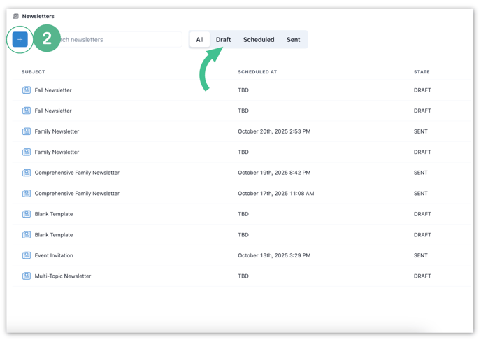 2. To start a newsletter from scratch, click on the plus “+” button. If you wish to continue a newsletter you previously drafted, click on Drafts and select the one you want to edit.