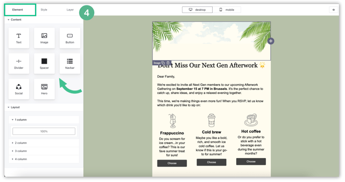 4. From the Elements tab, drag and drop content blocks, such as images, text, dividers, or space, directly into your newsletter.