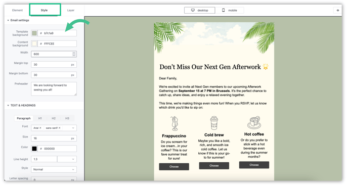 Under Styles, customize your newsletter’s appearance. You can define the background color, adjust layout settings, and add the email subject line from the tab Preheader. From there, you will also be able to modify the look and feel and your text and headings or the buttons you had in your newsletter.