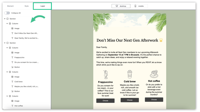 In the Layers tab, rearrange with a drag and drop the order of your content blocks to organize your newsletter exactly as you want.