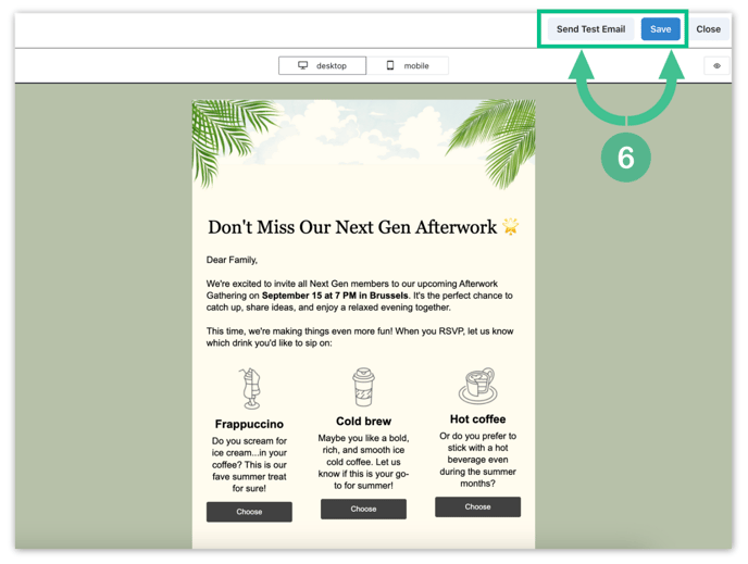 6. When you are happy with the final result, select Save to keep all your changes, and if needed, send a test email to yourself or another email.