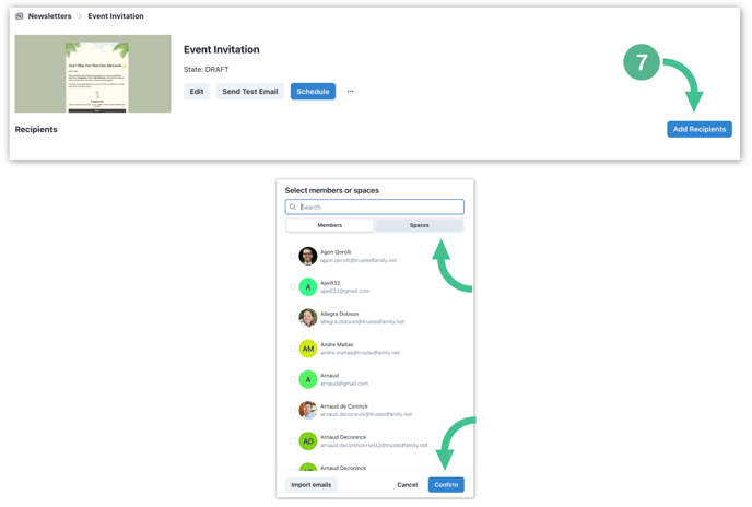 7. After saving your newsletter you will be redirect to the main page of that newsletter. Click on Add recipients to select who will receive your newsletter. A pop-up window will open. There, select members or choose an entire space. You can also import a list of emails.