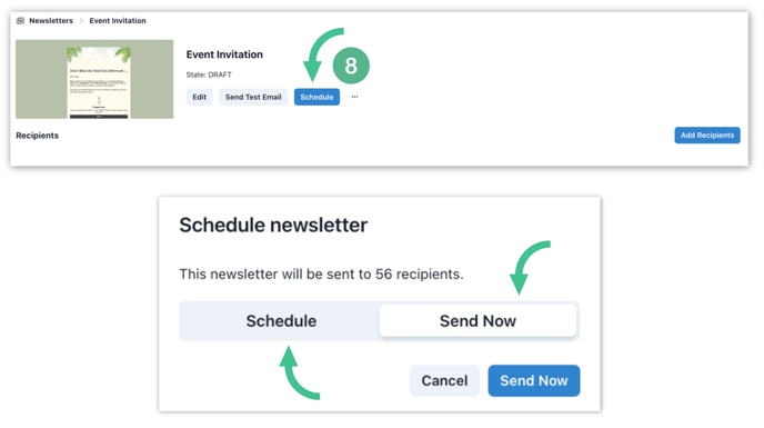 8. Finally, you can choose to send your newsletter now or schedule it for later. Click on Send Now or Schedule.