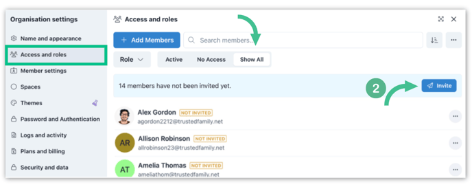 2. Navigate to the Access & Roles tab. On Show All, you will see a list of all your members, making it easy to spot those who have not yet received an invitation (labeled "Not Invited"). To invite all these members to join the platform, simply click the Invite button in the top right corner. Press the Invite button again in the pop-up window that appears.